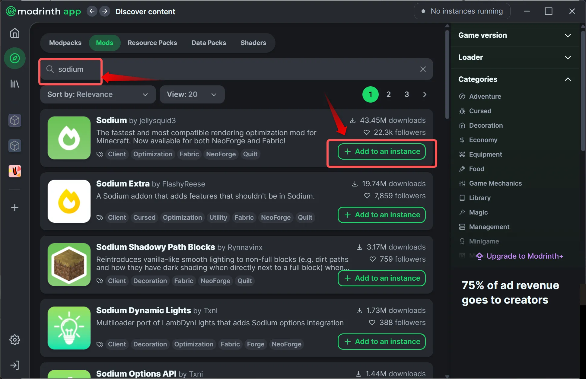 検索欄にsodiumと入力すると「Sodium by jellysquid3」というMODがでてくるので+Add to an instanceをクリックします