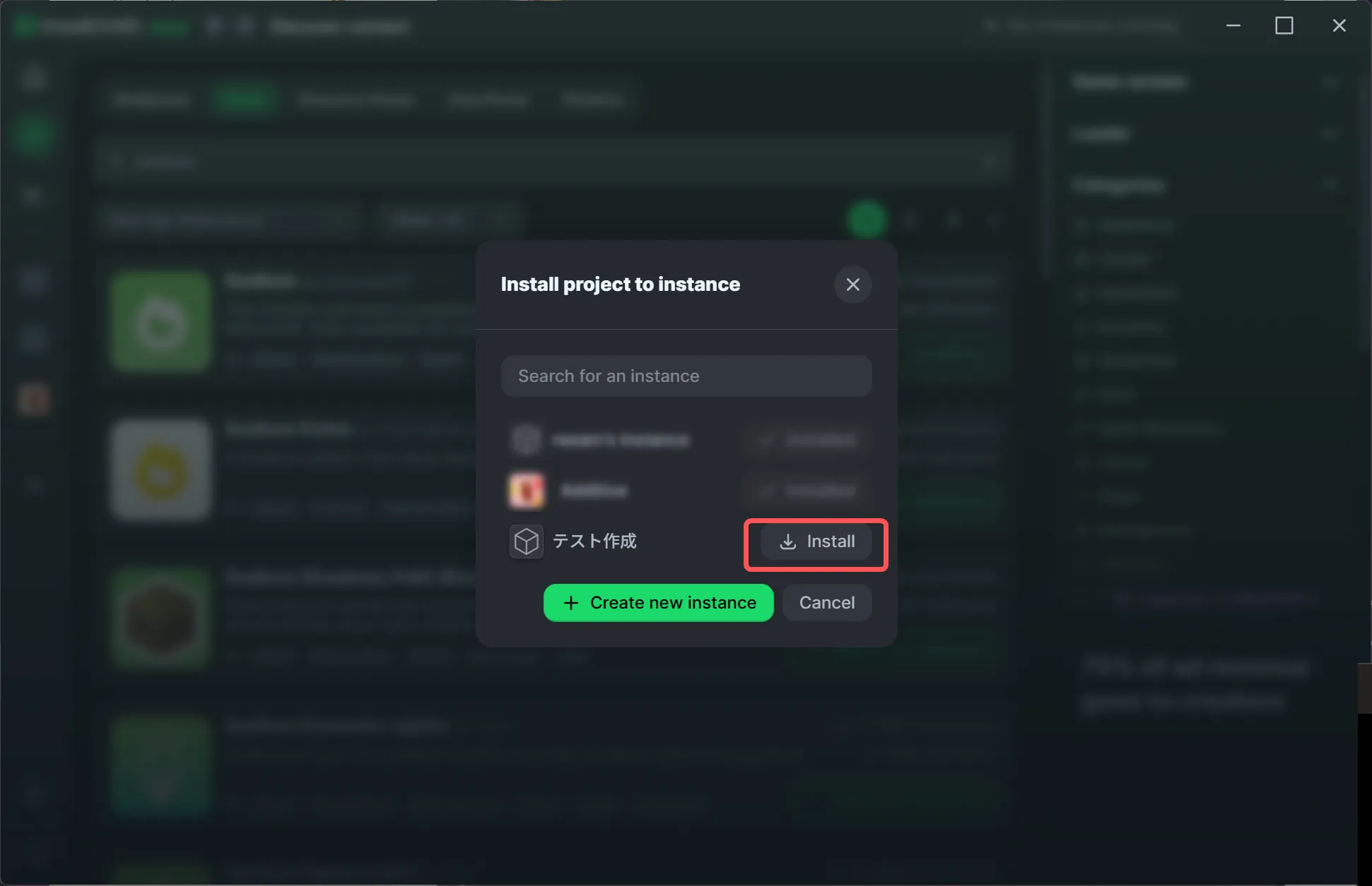 Install project to instanceというポップアップがでてきたら、先ほどつくったインスタンスを選択してinstallをクリックするとインストールは完了です✨