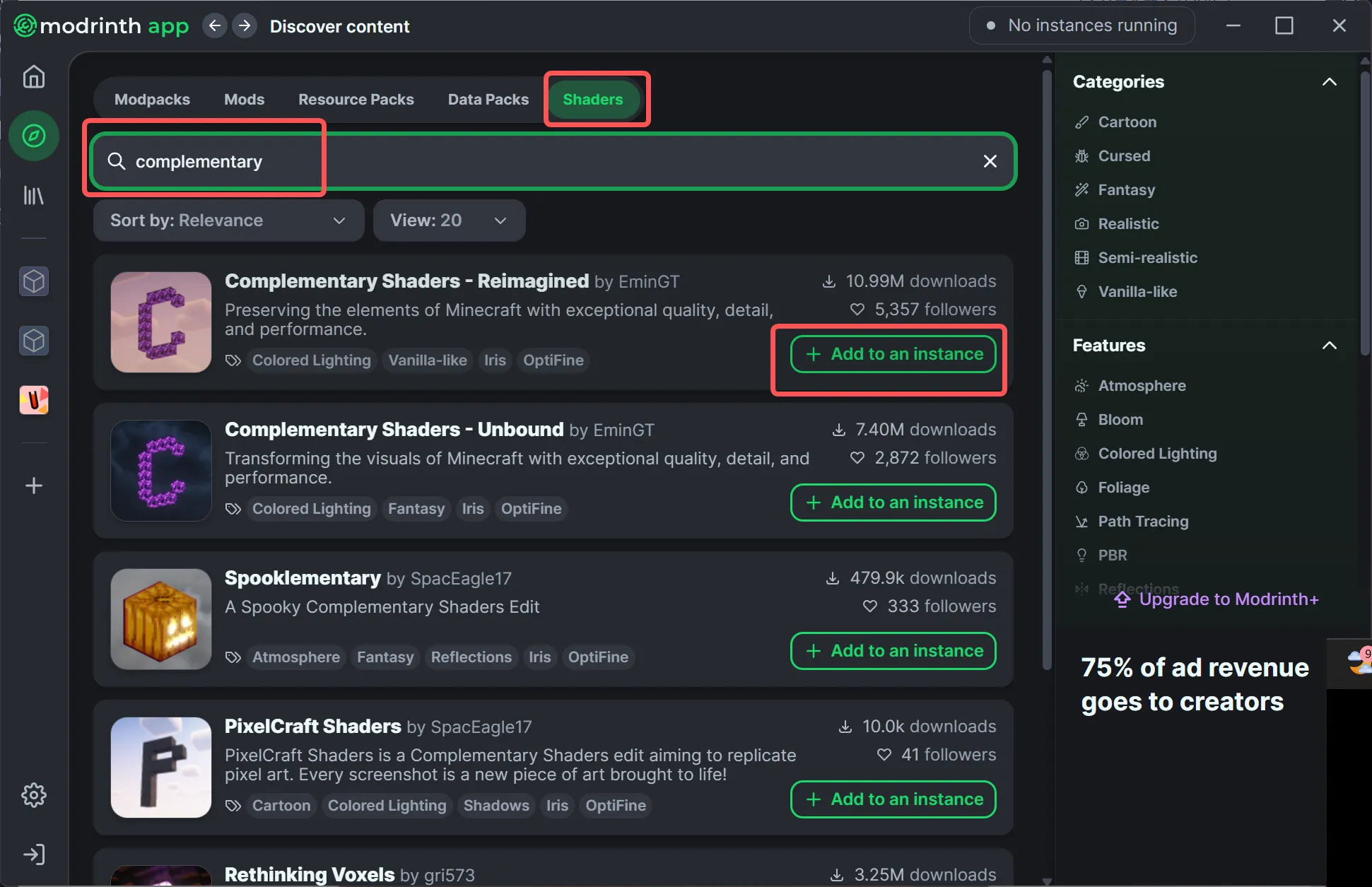これも世界中のクリエイターが個性豊かなシェーダーを作っていますが、今回は有名な「Complementary Shaders-Reimagined」を入れてみます。